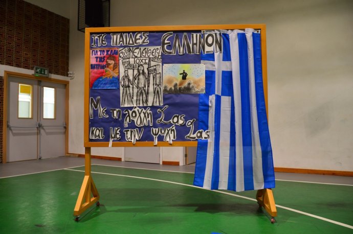 Το δεύτερο μέρος περιελάμβανε σύντομη ιστορική αναδρομή στον ελληνοϊταλικό πόλεμο, την τριπλή κατοχή της Ελλάδας από τους Γερμανούς, Ιταλούς και Βούλγαρους, και τη συμβολή της χώρας στη νικηφόρα εξέλιξη του Β΄ Παγκοσμίου Πολέμου. Η ιστορική αναδρομή πλαισιωνόταν από πεζά και ποιητικά κείμενα, οπτικοακουστικό υλικό, τραγούδια από τη χορωδία και ορχήστρα και ολοκληρώθηκε με ελληνικούς παραδοσιακούς χορούς από τη χορευτική ομάδα του Σχολείου.