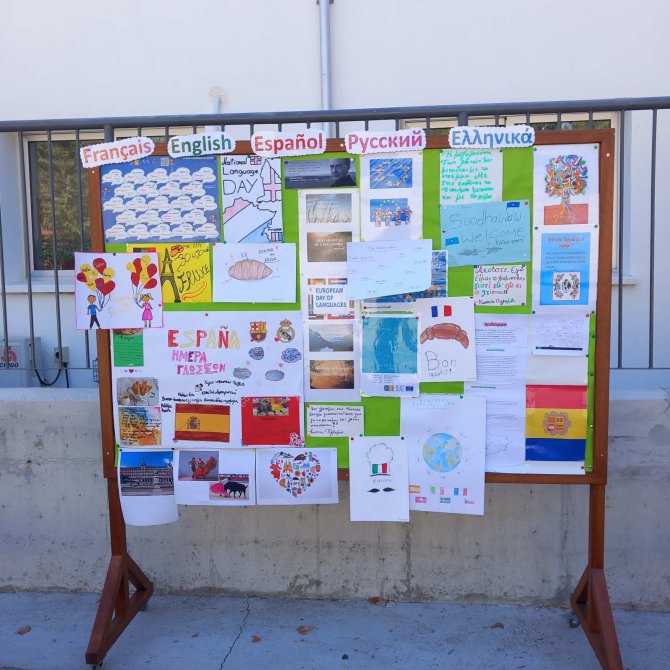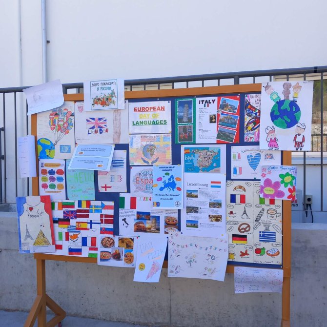 Συγκεκριμένα, πολλά παιδιά ετοίμασαν αφίσες και κατασκευές με θέμα τις γλώσσες που διδάσκονται στο Σχολείο μας: Αγγλικά, Γαλλικά, Ισπανικά, Ρωσικά και Ελληνικά.