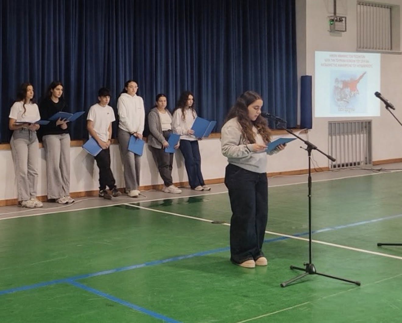 Την Παρασκευή, 14 Νοεμβρίου 2025, το Απεήτειο Γυμνάσιο Αγρού σε μια σεμνή, αλλά βαθύτατα συγκινητική εκδήλωση, καταδίκασε την παράνομη ανακήρυξη του ψευδοκράτους. Οι μαθητές και μαθήτριες του Κεντρικού Μαθητικού Συμβουλίου αναφέρθηκαν στην τουρκική εισβολή του 1974 και στις οδυνηρές συνέπειες που βιώνει το νησί μέχρι και σήμερα, στην παράνομη ανακήρυξη του ψευδοκράτους τον Νοέμβριο του 1983, καθώς και στις επανειλημμένες προσπάθειες για εξεύρεση δίκαιης και βιώσιμης λύσης του Κυπριακού, που θα επανενώνει τον τόπο και θα διασφαλίζει τα δικαιώματα όλων των νόμιμων κατοίκων του. Η Χαρά Γεωργιάδη, πρόεδρος του Κ.Μ.Σ., ανέγνωσε το ψήφισμα της ΠΣΕΜ για την καταδίκη του ψευδοκράτους. Οι μαθητές και οι μαθήτριες με τη νεανική τους φωνή εξέφρασαν την προσήλωσή τους στις αρχές της ελευθερίας, της δημοκρατίας και της ενότητας της Κυπριακής Δημοκρατίας. Ένα τεράστιο μπράβο στα μέλη του Κ.Μ.Σ. που συμμετείχαν στην παρουσίαση της εκδήλωσης!
